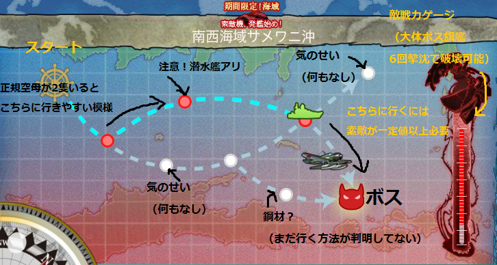 このマップに書いたとおり、ボスにたどり着くにはある程度の索敵能力が必要になります。(ボス一歩手前まで来ると羅針盤回しの後偵察機を飛ばす演出が入り、敵を発見するとボスに向かいます)