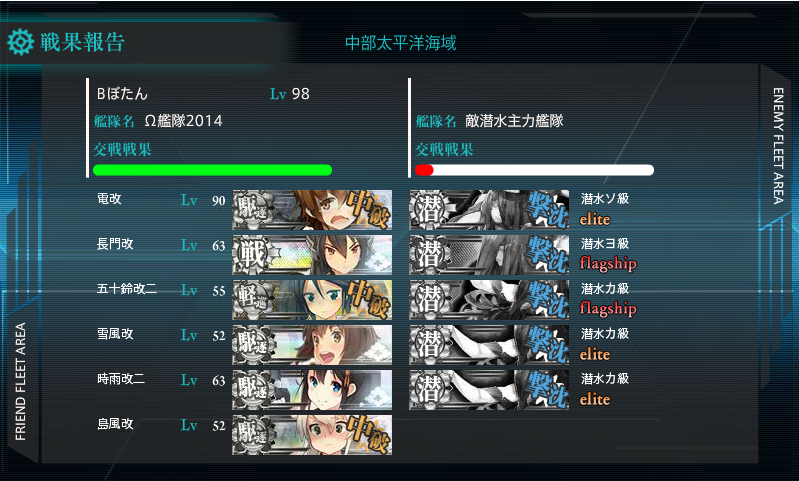 このステージは敵の半数が潜水艦隊で、ボス艦隊も潜水艦オンリー。攻略するには、ソナーや爆雷と言った対潜装備を整えることが第一条件となります。