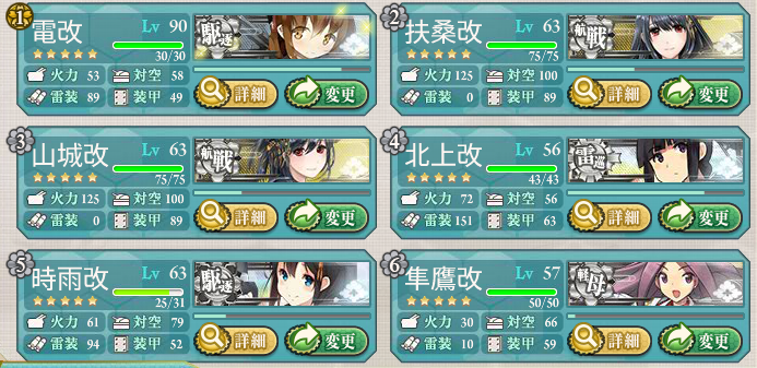残りの枠には戦艦か航空戦艦(カ号観測機があるならそれを装備した航空戦艦がベスト)を入れておき、空母ヲ級改マスでは戦艦に頑張ってもらいつつ駆逐艦が大破しないよう祈るというやり方になります。