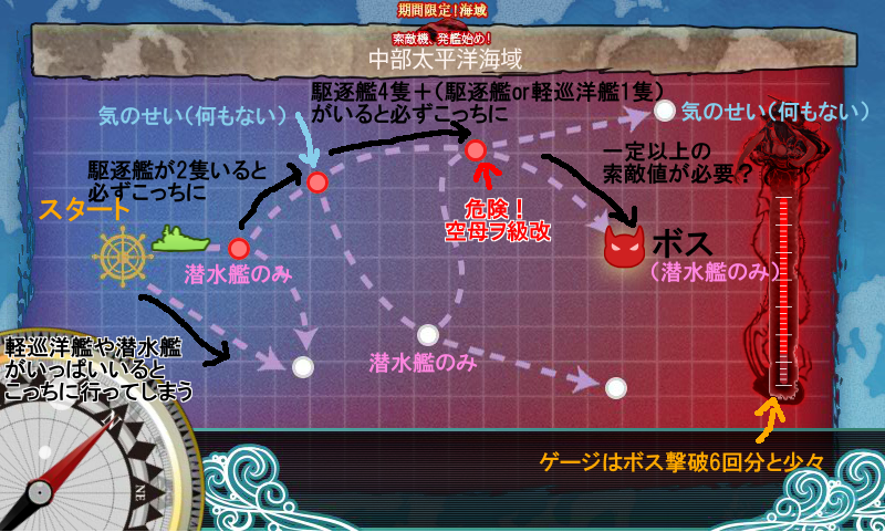 艦隊に駆逐艦5隻または駆逐艦4隻+軽巡洋艦1隻を入れると必ずボスがいるルートに向かうことができます。(軽巡洋艦2隻だったり、重雷装巡洋艦が入るとそれる可能性があります)