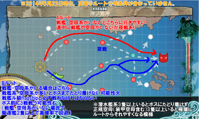 わたくしもこれに則って何度か挑戦してみましたが、Aルート狙いの場合は2戦目で敵艦のカットイン攻撃によって大破しやすく、ボスまでたどり着けても夜戦を迎える前にボロボロの状態にされてまともにボスにダメージを与えられず。平均Lv50以上あるんですがねえ…