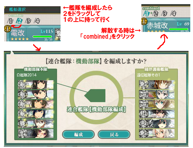 そして、左上の「2」のマークをドラッグして、「1」の上に持って行くと、連合艦隊を編成する事ができます。