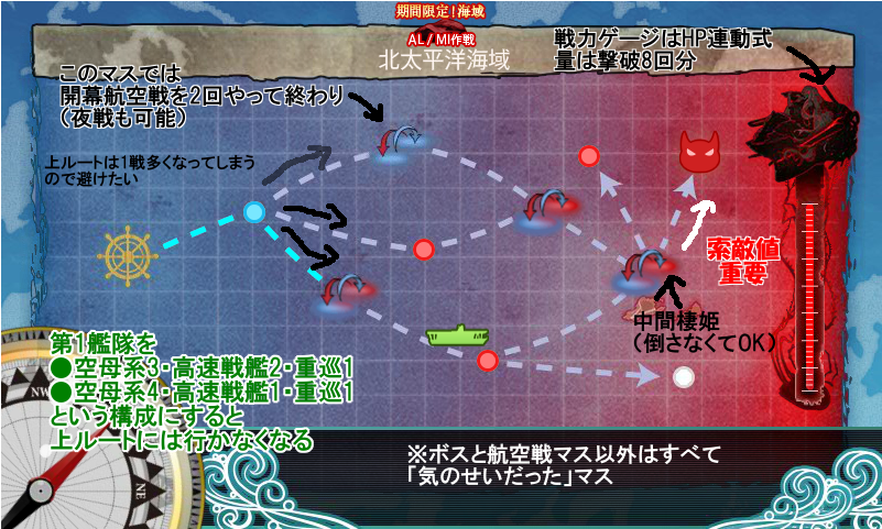 このステージは、ボス戦以外がすべて矢印マス(航空戦マス)になっていて、連合艦隊の仕様を学ぶ意味合いが強いステージです。