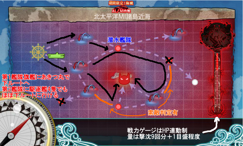 上ルートは潜水艦隊との戦いがあり、ランダムでわき道にそれる事があるものの、基本的に1戦少なくて済むルート。