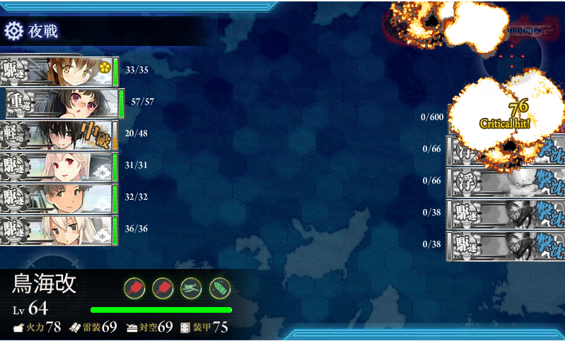 わたくしは大体20回近くのトライでクリア。最低でもボスとは10回戦わないといけないので、各資源(とくにボーキ)の消費が心配です。