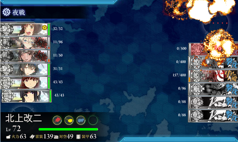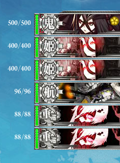 目安として、昼戦終了時に戦艦棲姫2隻は小破以上(旗艦をかばえなくなるため)にし、下の3隻は撃沈させる、その位の状況に追い込むことができないのであればおそらく勝機はないでしょう。