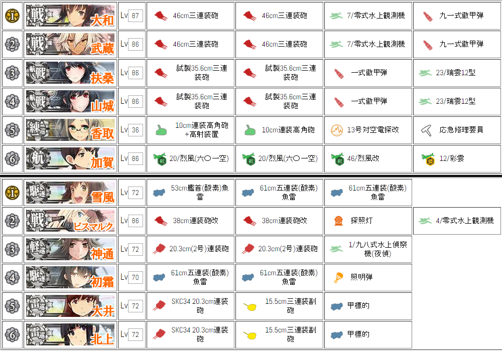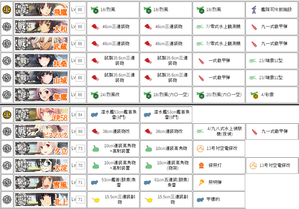 第1艦隊の戦艦を「主砲×2+偵察機+徹甲弾」としたのは、敵に高装甲艦が多いので弾着観測でカットイン射撃を狙うため。