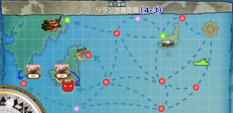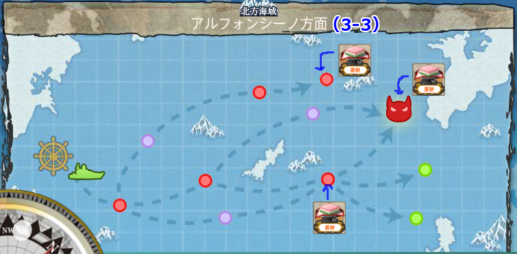 ボスマスと右下の外れルート終点に菱餅ポイント。この外れルート終点には必ず輸送艦が3隻いるのでろ号作戦とかの他の任務も一緒にこなせます。