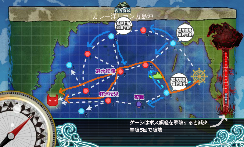 能動分岐が3か所あり、索敵が足りないとか潜水艦だらけとかでなければどんな艦隊でもボスまでたどり着ける海域です。
