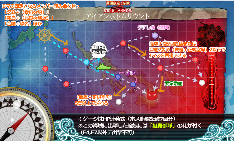 迂回ルートにはうずしおがありますが、これは艦隊に龍驤と駆逐艦2隻がいれば回避することができます(または駆逐艦2隻で(戦艦+正規空母)2隻以下)。