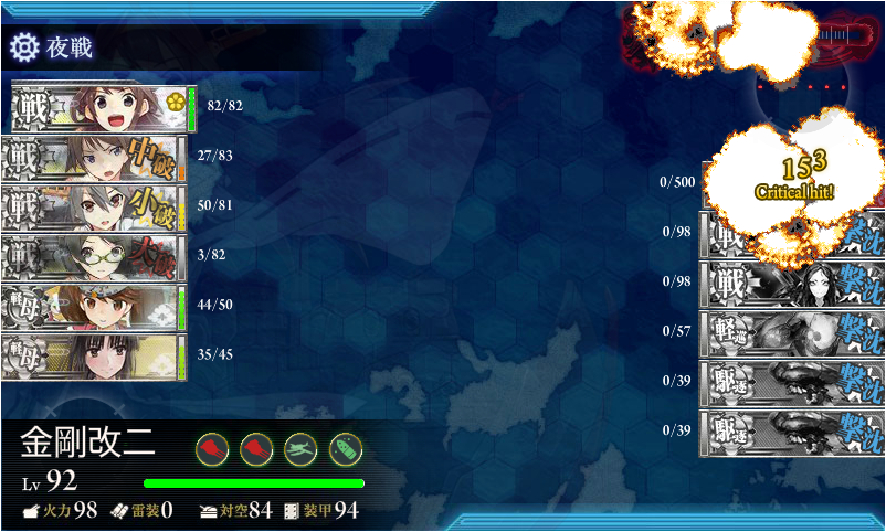 真ん中突っ切りルートはまさかの夜戦2連発。こちらは戦艦と正規空母の合計が4以下であればOKですが、ボスマスで艦載機が飛んでくるので1隻は空母を入れておく必要があります。あとは誰かに夜偵を持たせておきます。