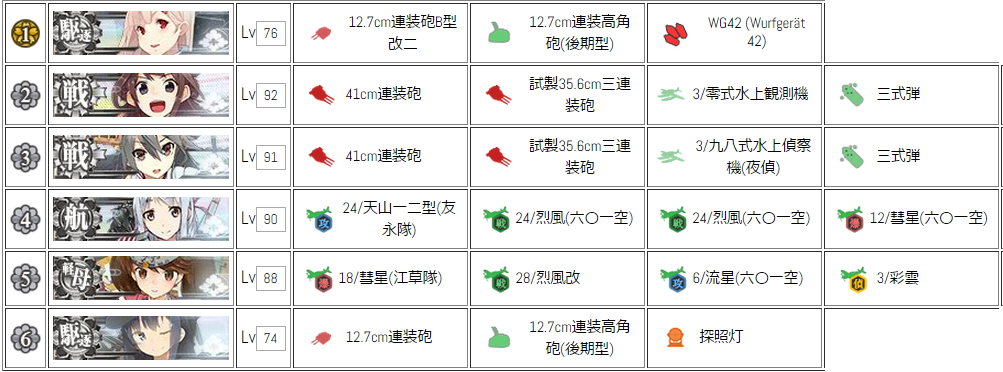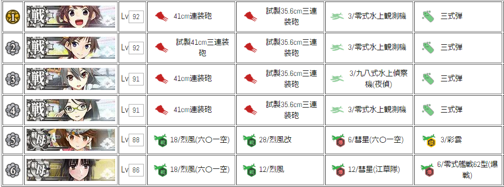 中央ルートでは、ルート固定役の金剛+榛名(比叡+霧島)に戦艦1隻、航空巡洋艦2隻、正規空母1隻という編成。