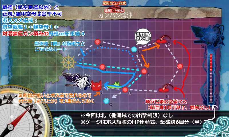 通常の攻略であれば、(A→EorB)→F→D→Jとルートを取ることになります。索敵値が低いと逸れることがあるので、彩雲か水上偵察機を1つ持ってきた方が良いです。