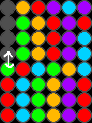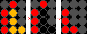 この図の場合、紫を4つくっつけて消すと、紫が消えたところに青が落ちてきて消え、青が消えたところに緑が…と次々に消えていき、5れんさとなります。