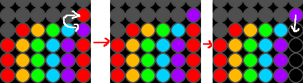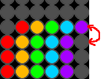 この図では、4段目の一番右の紫の下に赤を3つ並べ、紫の上にいったん赤を持っていきます。